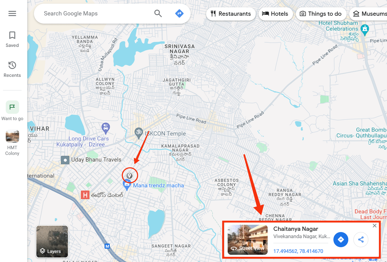4. A tiny card with the details of the location will appear on the bottom-right corner of the screen. Click on it.