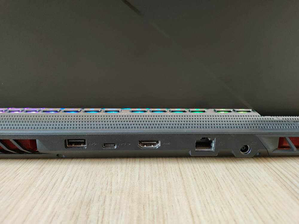There are three USB A ports (3.0), 2 on the left, and one at the back. The USB-C port (3.1 Gen2) integrates DisplayPort. Or an external monitor can be paired via the HDMI port, also on the back. Strix Scar lineup doesn’t support G-sync, though.
