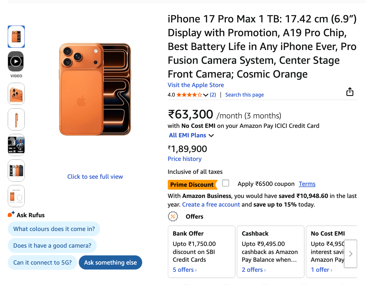 | iPhone 17 Pro Max (1TB) | Rs. 1,89,900 | Rs. 1,89,900 | Rs. 6,500 | Rs. 9,170 (Amazon Pay ICICI cashback) | Rs. 1,74,230 | Rs. 15,670 | Buy Now |