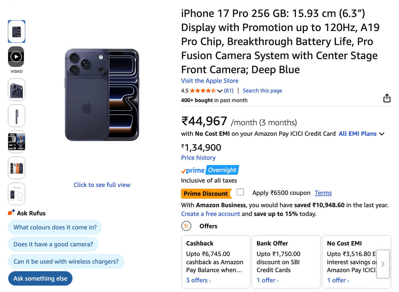 | iPhone 17 Pro (256GB) | Rs. 1,34,900 | Rs. 1,34,900 | Rs. 6,500 | Rs. 6,420 (Amazon Pay ICICI cashback) | Rs. 1,21,980 | Rs. 12,920 | Buy Now |