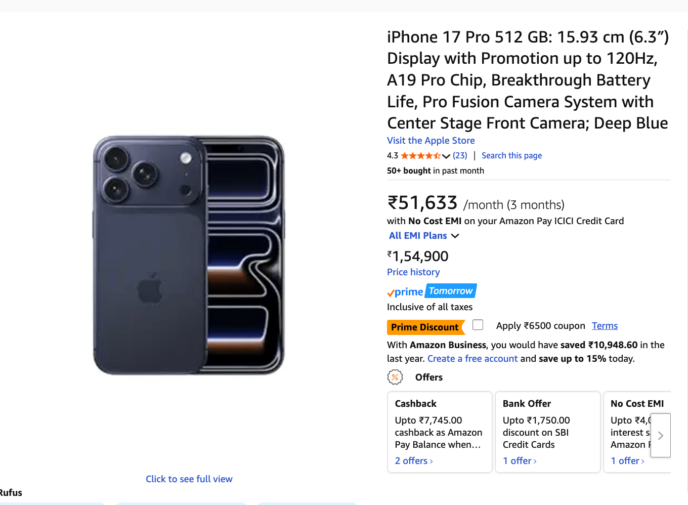 | iPhone 17 Pro (512GB) | Rs. 1,54,900 | Rs. 1,54,900 | Rs. 6,500 | Rs. 7,420 (Amazon Pay ICICI cashback) | Rs. 1,40,980 | Rs. 13,920 | Buy Now |