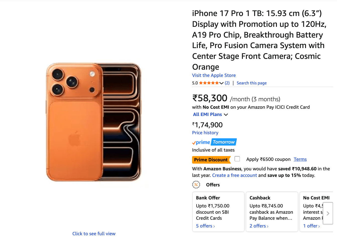 | iPhone 17 Pro (1TB) | Rs. 1,74,900 | Rs. 1,74,900 | Rs. 6,500 | Rs. 8,420 (Amazon Pay ICICI cashback) | Rs. 1,59,980 | Rs. 14,920 | Buy Now |