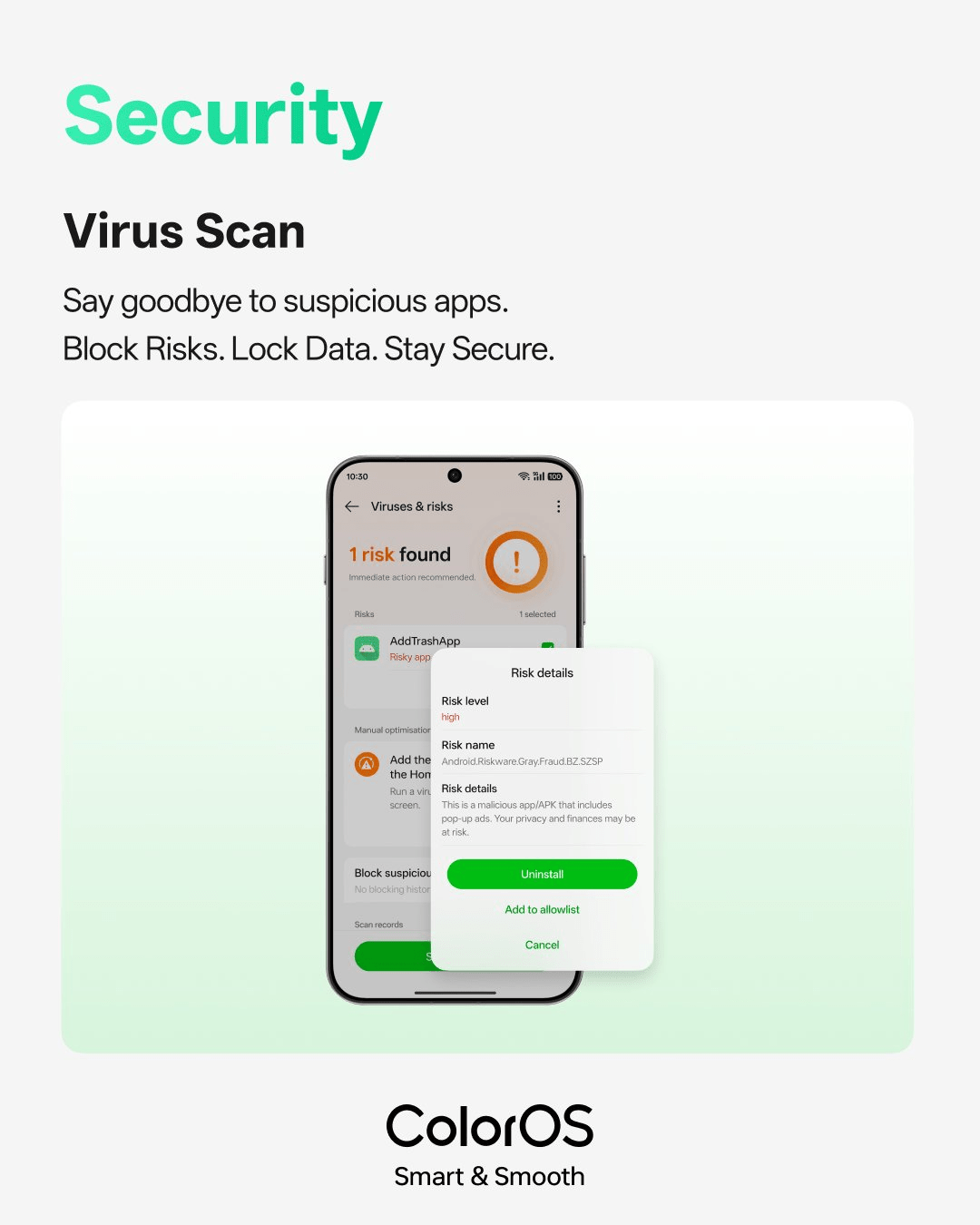 On the security side, OPPO has added a built-in virus scan that can detect and remove suspicious apps directly within the system. This update also includes the March 2026 security patch.