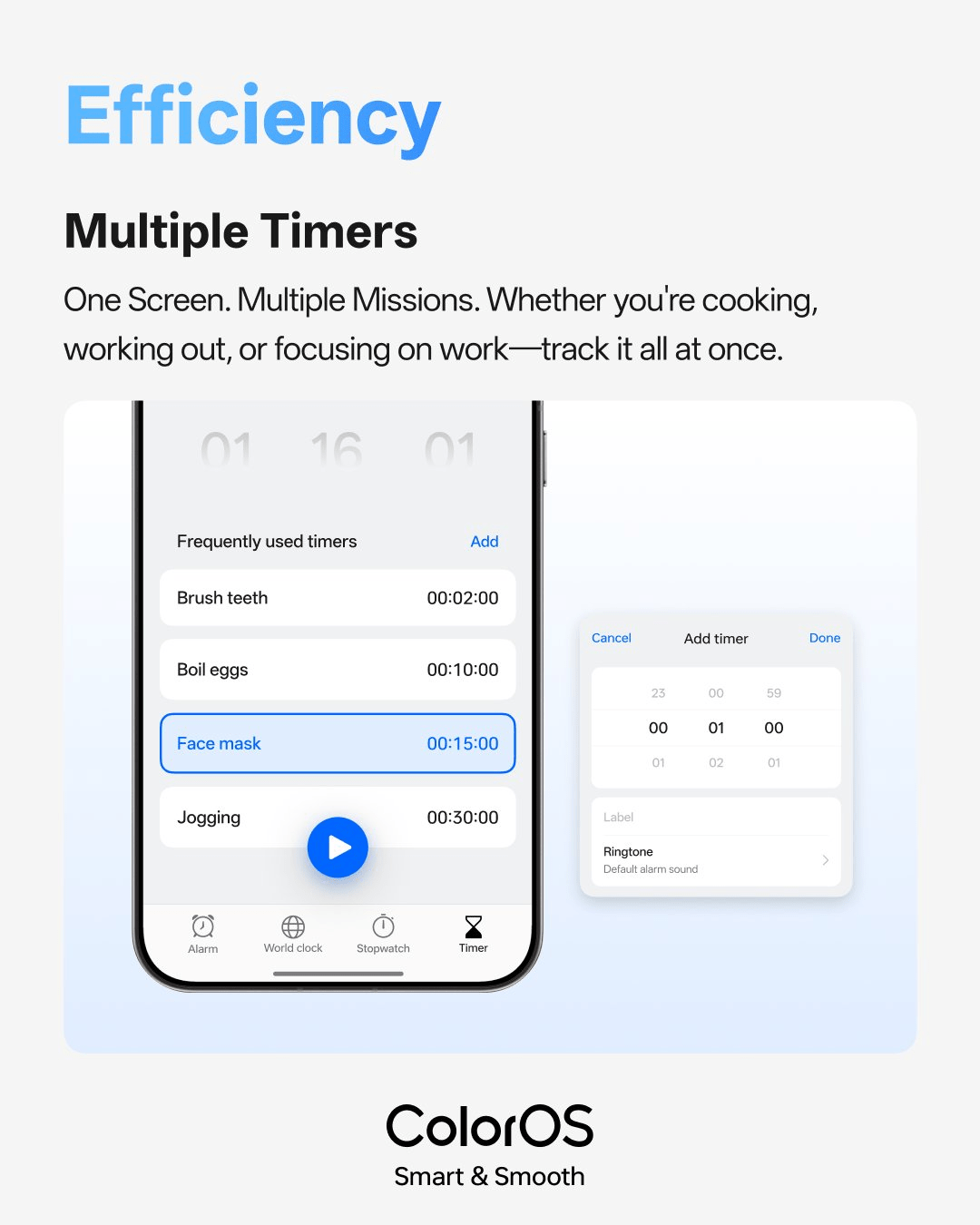 One of the more noticeable additions is support for multiple timers at the same time. You can run and track multiple timers together, which makes it more useful for things like cooking or workouts. Timers now also show exact stop times, so you know exactly when they’ll end. There’s also a quick option to add another timer or reuse ones you use often.