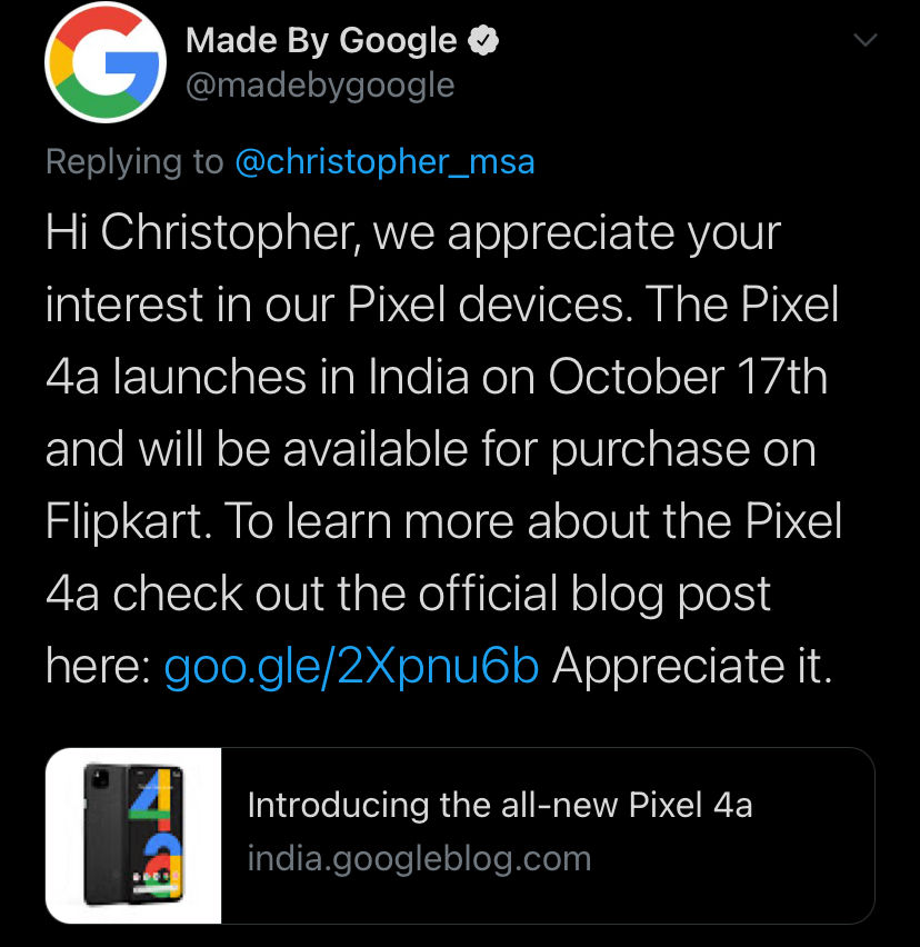 Although the newly unveiled Pixel 5 and Pixel 4a 5G won’t be making their way to India, the regular Pixel 4a (non-4G one) is set to launch in the country on Oct 17. This has been confirmed by the brand itself through Twitter. The official “Made by Google” handle has revealed the detail to some eager users, who are likely from the #teampixel club.