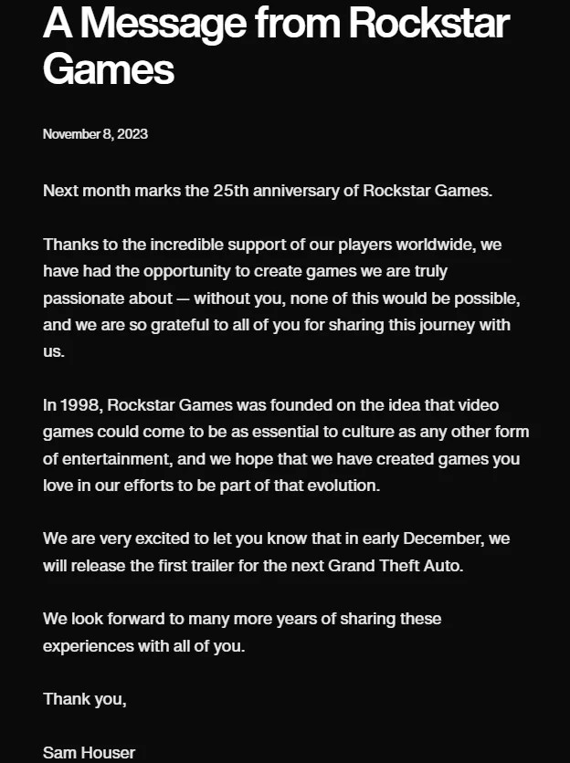 The message promised that there would be a proper intro to the game in December 2023. However, even the trailer got leaked earlier in December 2023 and Rockstar Games had to release it before the decided date.