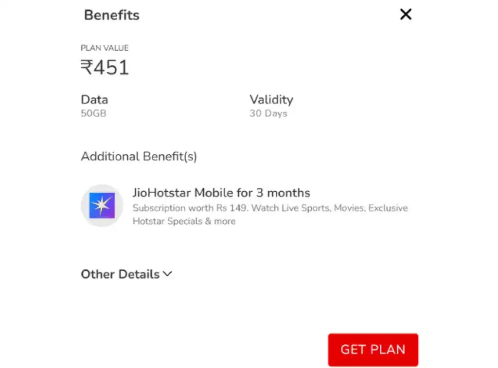 इस प्लान में 30 दिनों के लिए 50GB अतिरिक्त डाटा मिलेगा और साथ में 3 महीने के लिए JioHotstar Mobile का सब्सक्रिप्शन। इस प्लान की 30 दिन की अवधि केवल 50GB डाटा के लिए ही है। हालांकि इसमें कॉलिंग और मैसेज की सेवा नहीं मिलेगी, क्योंकि ये एक डाटा पैक है, जिसे आप अपने वर्तमान प्लान के साथ ले सकते हैं।