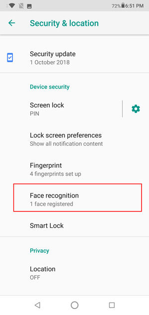 सामान्य फिंगरप्रिंट सेंसर के साथ-साथ Zenfone Max Pro M1 की ही तरह यहाँ पर भी आपको फेस अनलॉक का फीचर दिया गया है। फेस अनलॉक का इस्तेमाल करने के लिए आपको जाना होगा सेटिंग्स >> सिक्यूरिटी और लोकेशन >> फेस रिकग्निशन और फिर अपने चेहरे को कैमरा के माध्यम से सबमिट करना होगा।
