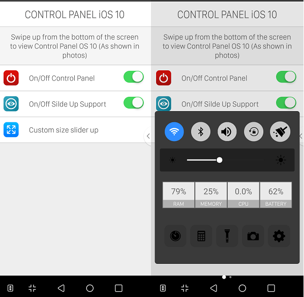 यह एप आपको एंड्राइड डिवाइस में iPhone के जैसे कण्ट्रोल सेण्टर की सुविधा देता है। इस कण्ट्रोल सेण्टर द्वारा आपको WiFi, ब्लूटूथ, टोर्च,साइलेंट मोड, स्क्रीन टाइमआउट, और वॉल्यूम/ब्राइटनेस को कम/ज्यादा करने की सुविधा देता है। अगर आपको एंड्राइड के लिए कण्ट्रोल सेण्टर चाहिए तो कण्ट्रोल पैनल नाम की ये एप आपके लिए ही बनाई गयी है।