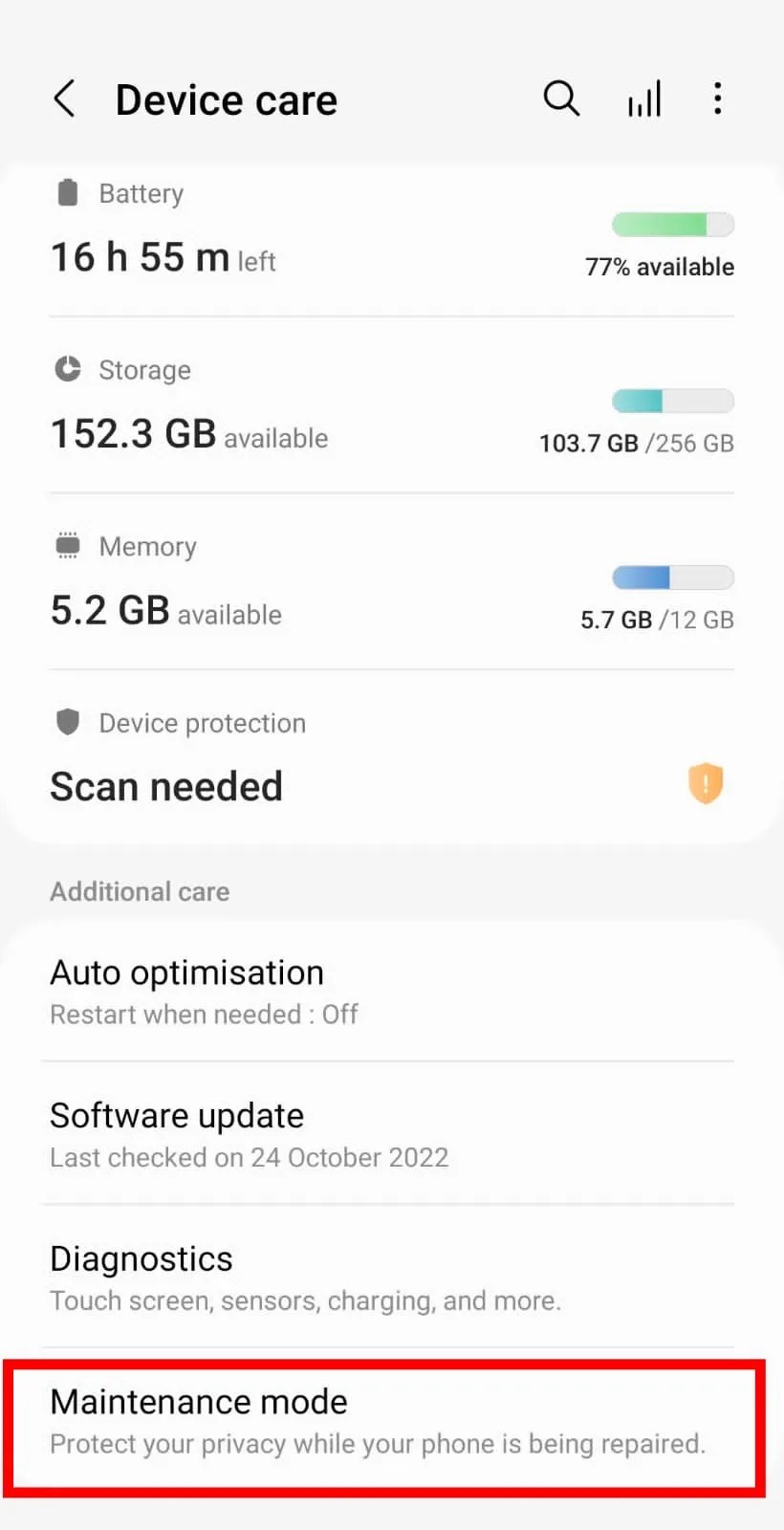 - नीचे स्क्रॉल करें, फिर “Additional care” विकल्पों के अंतर्गत, “Maintenance Mode” पर टैप करें।