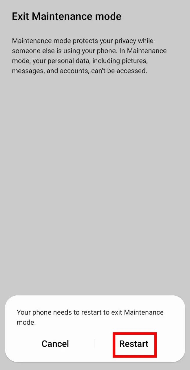 जब आप तकनीशियन से अपना फ़ोन वापस लेते हैं, तो आप Maintenance Mode को अक्षम करना चाहेंगे ताकि आप अपने सभी डेटा को फिर से एक्सेस कर सकें। यदि आपके पास एक Maintenance Mode अधिसूचना है, तो आप Maintenance Mode सेटिंग्स पर वापस जा सकते हैं। किसी भी तरह से, आपको अपनी पहचान सत्यापित करने के लिए अपना पिन, पैटर्न या फ़िंगरप्रिंट दर्ज करना होगा।