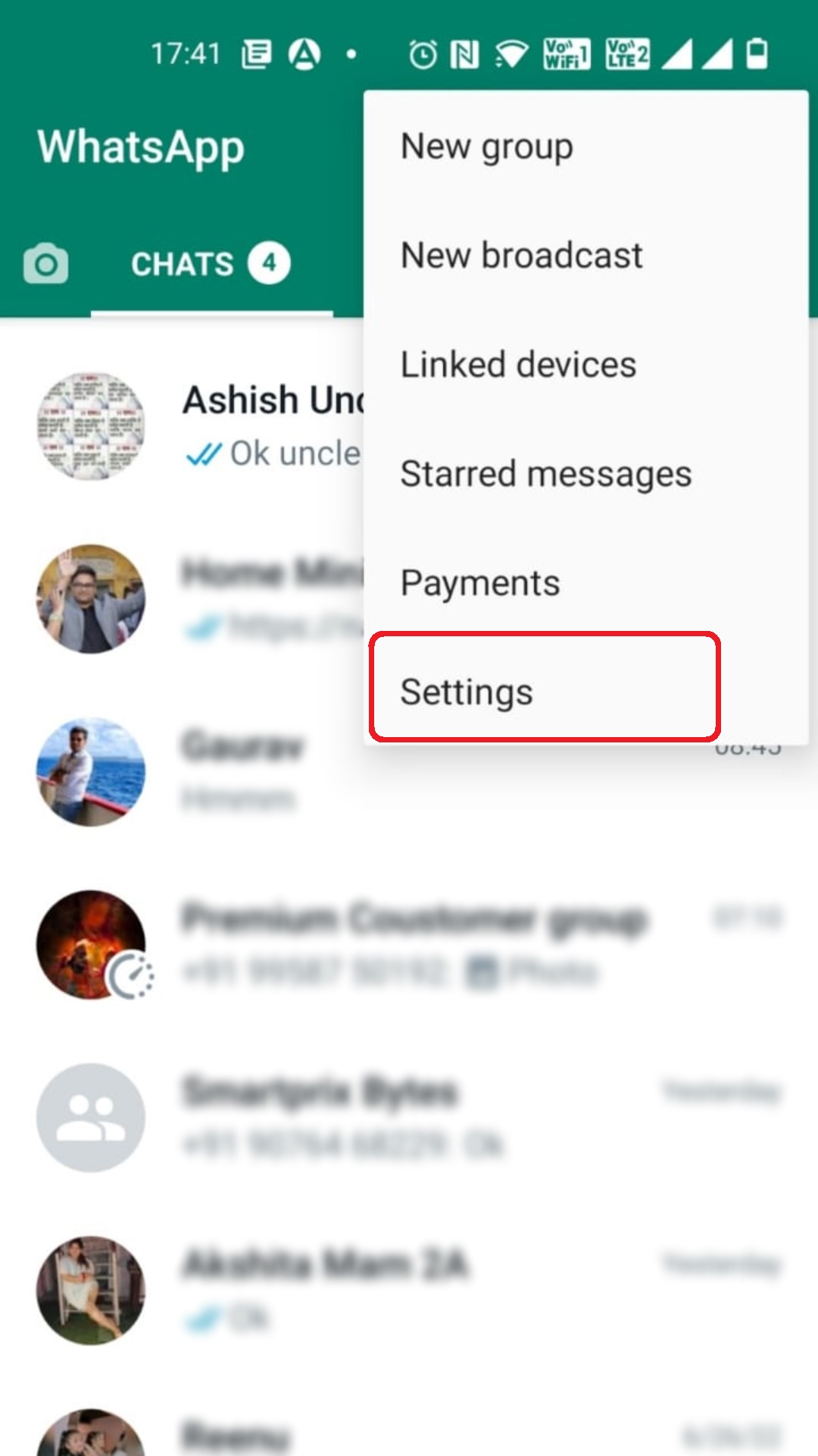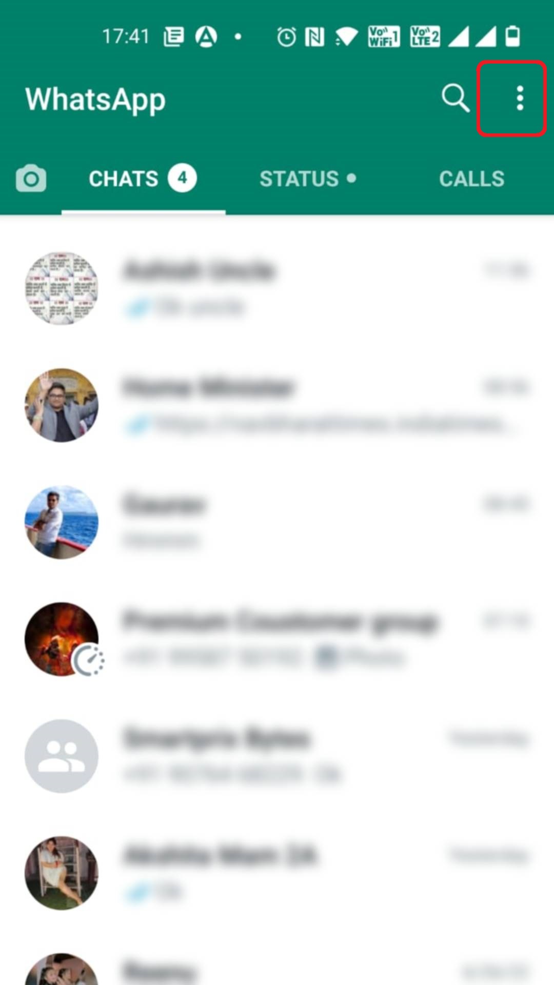 - WhatsApp ओपन करें और ऊपर दायीं तरफ दी हुई तीन डॉट पर क्लिक करें।