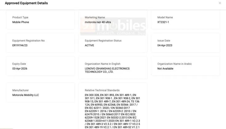 Motorola Razr 40 Ultra को UAE का TDRA सर्टिफिकेशन मिल गया है। इस फ़ोन को यहां XT2321-1 मॉडल नंबर के साथ देखा गया है। इस स्मार्टफोन को अभी हाल ही में चीन के CQC सर्टिफिकेशन साइट और कनाडा के REL प्लेटफॉर्म पर भी Motorola Razr+ 2023 के नाम से देखा जा चुका है। इन मंचों से इस स्मार्टफोन की बैटरी, चार्जिंग क्षमता के बारे में भी पता चला है।