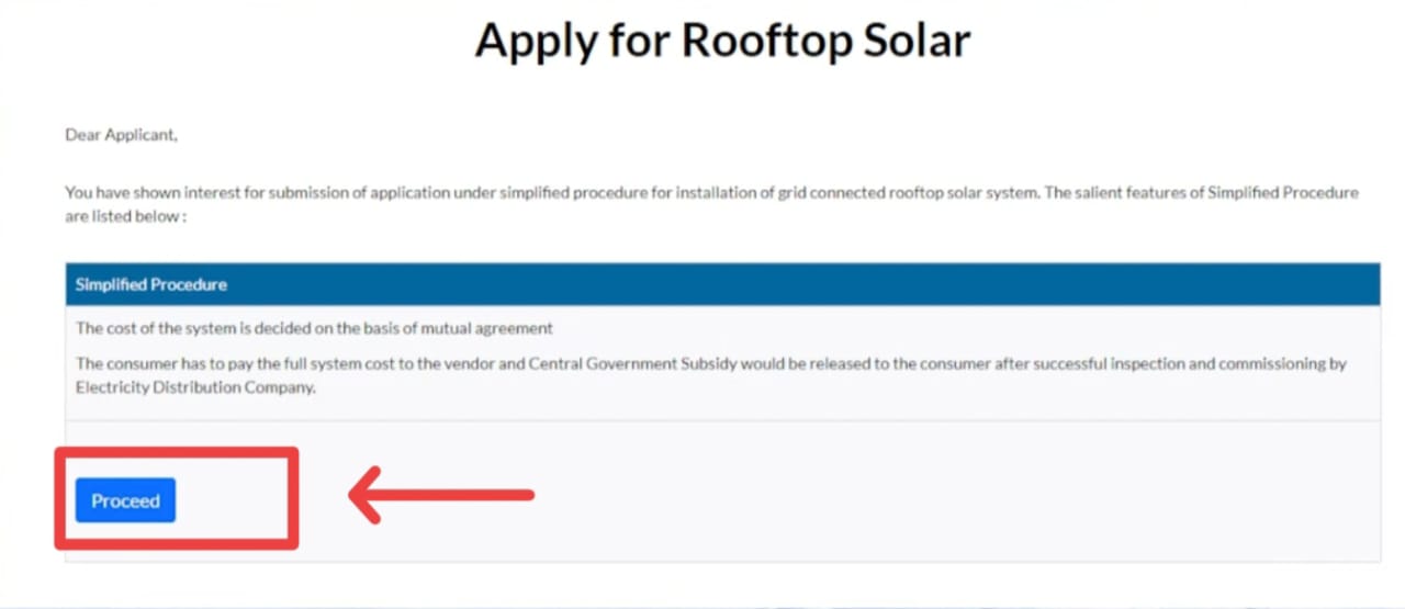 - इसके बाद “Rooftop Solar” के लिए अप्लाई करने के लिए “Proceed” के ऑप्शन पर क्लिक करें।