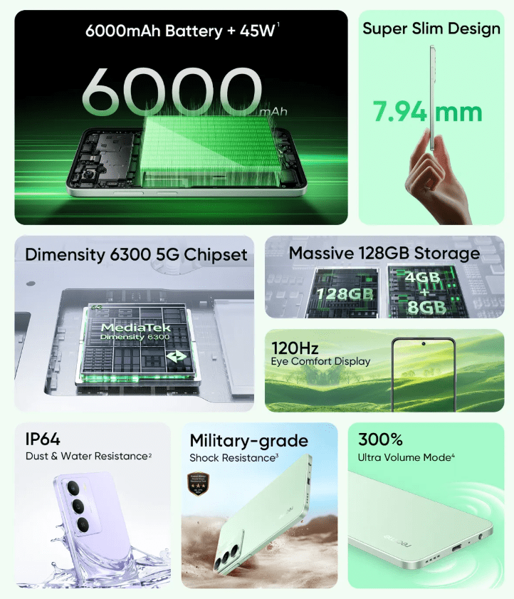फोन में 6.67 इंच का HD+ IPS LCD डिस्प्ले दिया गया है, जो 120Hz रिफ्रेश रेट को सपोर्ट करता है।. फोन MediaTek Dimensity 6300 6nm SoC द्वारा संचालित होता है। इसके अतिरिक्त, इसमें 4GB LPDDR4X RAM और 128GB UFS 2.2 स्टोरेज दी गई है। फोन हाइब्रिड ड्यूल सिम को सपोर्ट करता हज और Android 16 आधारित realme UI 6.0 पर रन होता है।