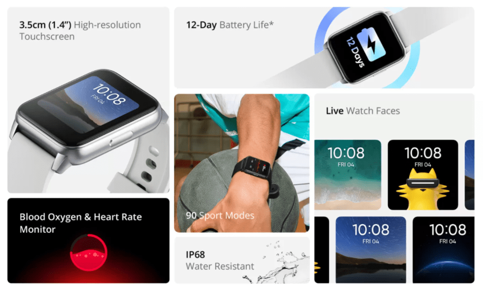 वाच में एडवांस्ड PPG सेंसर का इस्तेमाल किया गया है जो रियर टाइम हार्ट रेट को और भी सटीकता से मोनिटर करता है। यह वाच बेसिक हेल्थ और फिटनेस फीचरों के साथ आती है। बिल्ट इन ब्लड ऑक्सीजन लेवल मोनिटर कोरोनाकाल में काफी उपयोगी साबित होती है। स्मार्टवाच में आपको 90 स्पोर्ट्स मोड मिलते है, साथ ही IP68 रेटिंग इसको वटर स्पोर्ट्स के लिए सुरक्षित बनाती है।