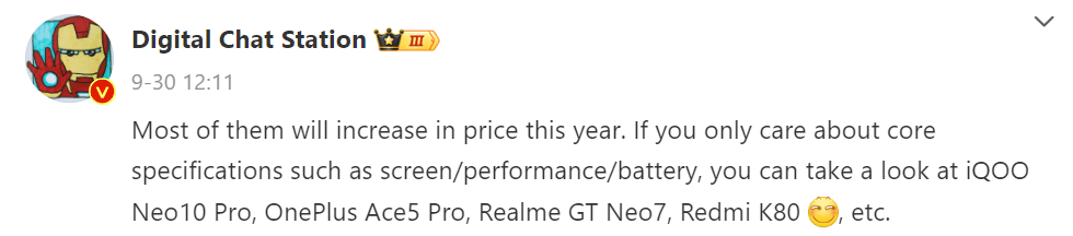 इसकी जानकारी चीनी टिपस्टर Digital Chat Station द्वारा Weibo पोस्ट के माध्यम से साझा की गयी है। जानकारी के अनुसार फ़ोन को दिसंबर 2024 तक लॉन्च किया जा सकता है। टिपस्टर के अनुसार जो फ़ोन Snapdragon 8 Gen 4 चिपसेट द्वारा संचालित होंगे, उनकी कीमत में वद्धि देखने को मिल सकती है, इसलिए यूजर्स को पुराने चिपसेट वाले फोन को उनकी परफॉरमेंस के अनुसार कम कीमत पर लॉन्च होने का इंतज़ार करना चाहिए।