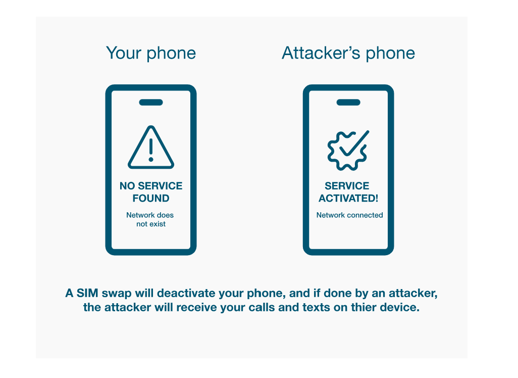 स्कैमर्स अलग अलग तरीकों से आपकी जानकारियाँ पाने की कोशिश करते हैं, जैसे आधार कार्ड, वोटर कार्ड, इत्यादि और उनके ज़रिये एक डुप्लीकेट सिम के लिए आवेदन देते हैं। ऐसे में यदि वो सफल होते हैं, तो उन्हें आपके फोन नंबर का एक्सेस मिल जाता है, जिसके बाद टू-स्टेप वेरिफिकेशन के साथ वो आपके बैंक अकाउंट या पेमेंट ऐप का भी एक्सेस पा सकते हैं। इससे बचने के लिए समय समय पर ये जाँचते रहना चाहिए कि आपकी सिम के पास हमेशा नेटवर्क कवरेज हो। यदि सिम कार्ड नेटवर्क कनेक्टिविटी नहीं है, तो आसार यही है कि किसी और ने आपके फोन नंबर की सिम ले रखी है। यदि आप अपनी सिम से मैसेज या कॉल नहीं कर पा रहे, तो सिम स्वैप होने की संभावना है।