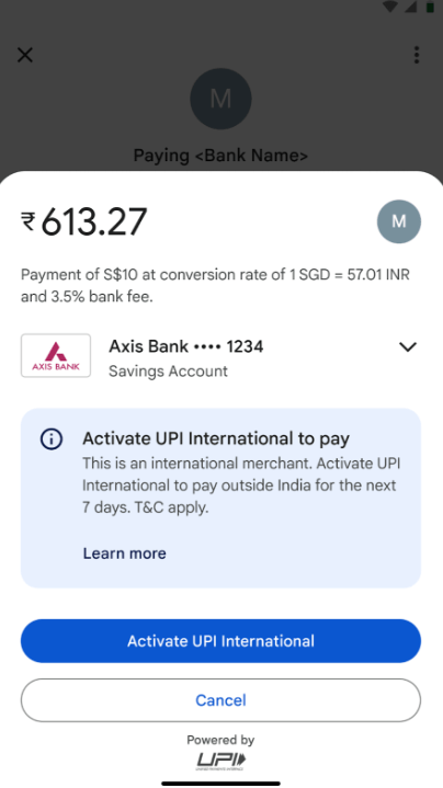- Tap on ‘Activate UPI International’ and proceed by entering the PIN