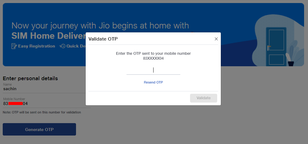 - Enter personal details including name and Jio mobile number. Click on generate OTP button.