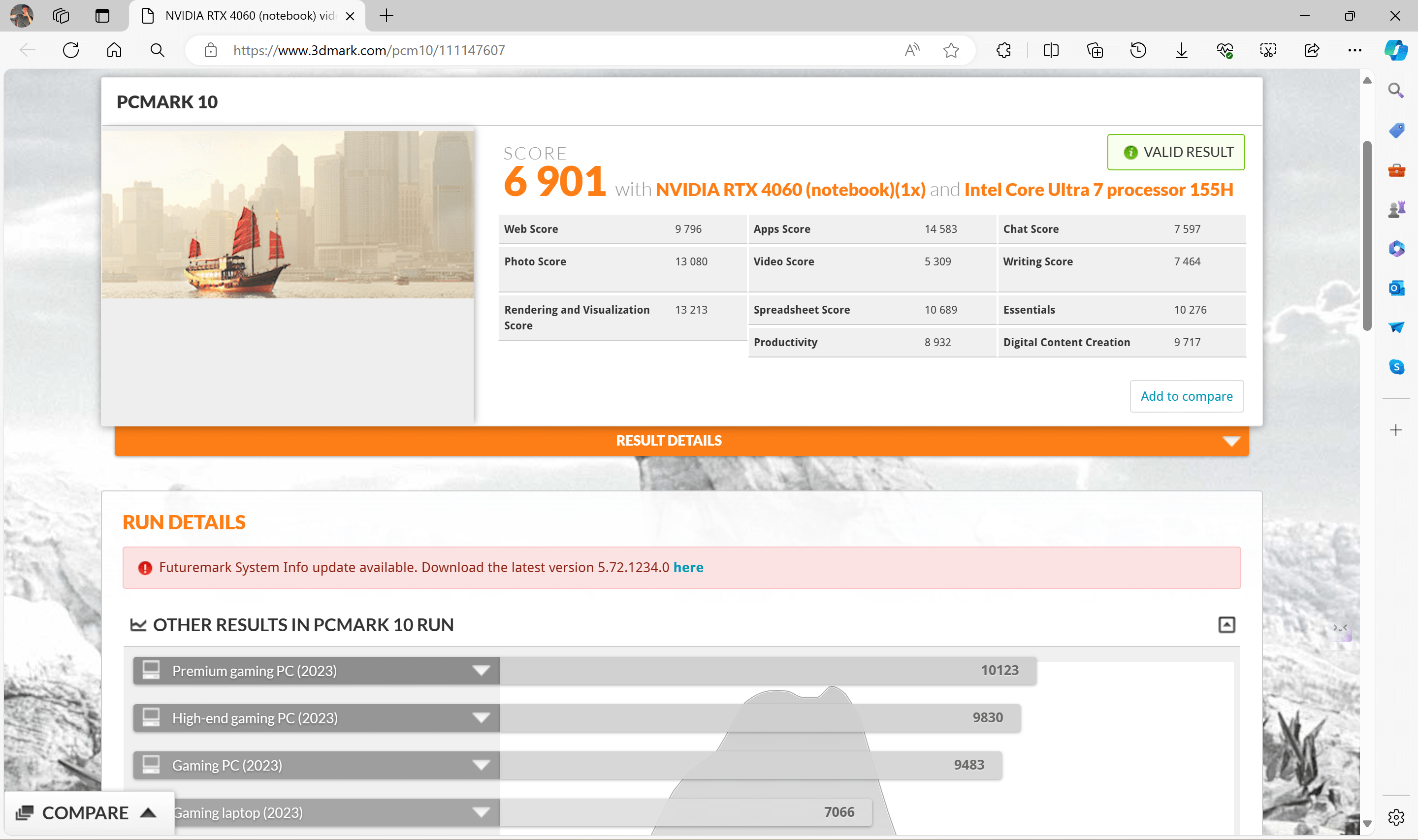 This machine’s RAM is 16 GB LPDDR5X clocked at 7467 MT/s. As for the GPU, this 14-inch machine packs an RTX 4060 GPU with a max TGP of 65W and 8 GB VRAM. There’s also an integrated graphics card, the Intel Arc GPU. To test this laptop’s performance, I ran a few benchmarks.