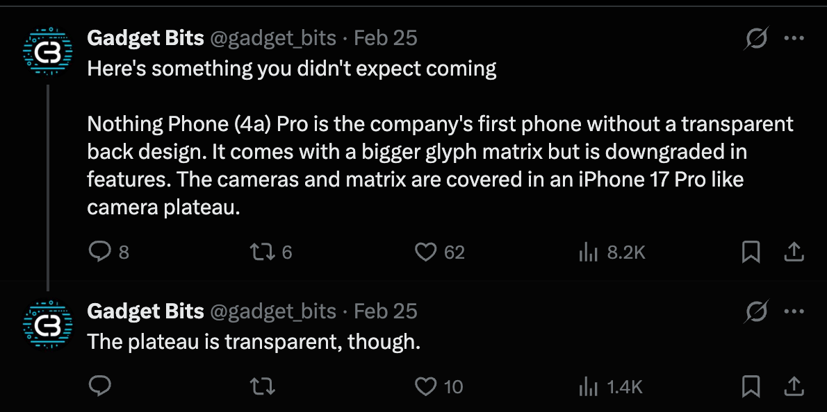 A leak from the Nothing-focused account @gadget_bits on X has revealed several details about the upcoming Nothing Phone (4a) Pro just days before the March 5 “Built Different” launch event.