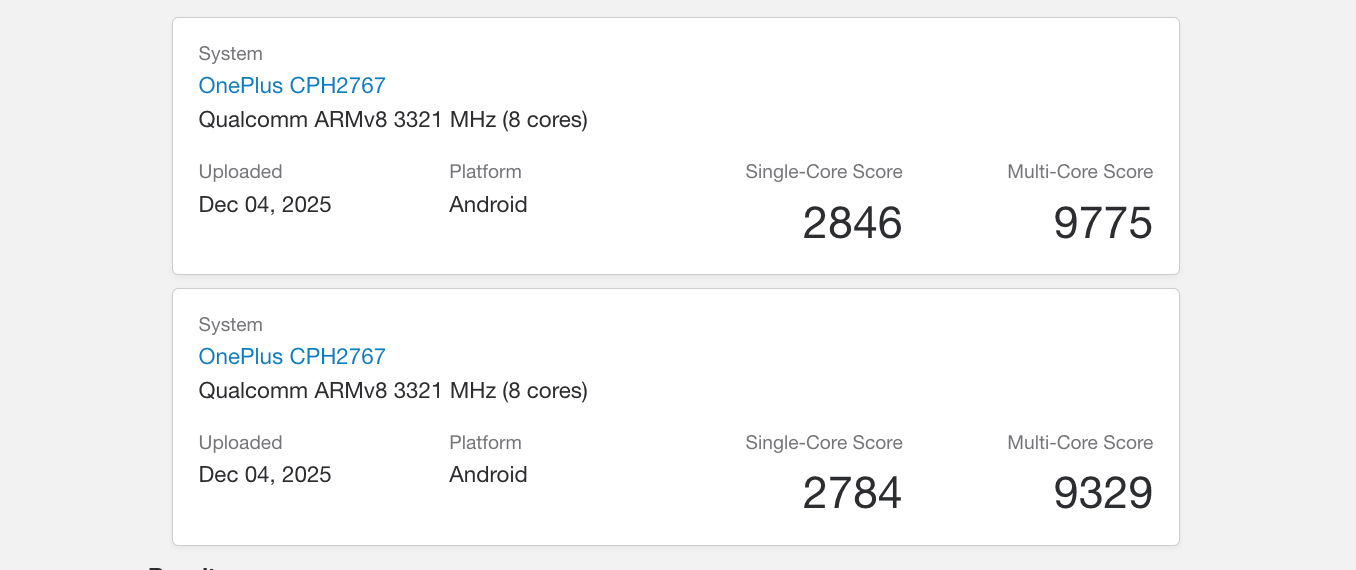 The OnePlus handset bears the model number “OnePlus CPH2767.” Although the listing doesn’t mention the processor it is based on, the core configuration confirms it is the Snapdragon 8 Gen 5 SoC. That said, here’s what the handset and the chipset score in GeekBench 6’s CPU test.