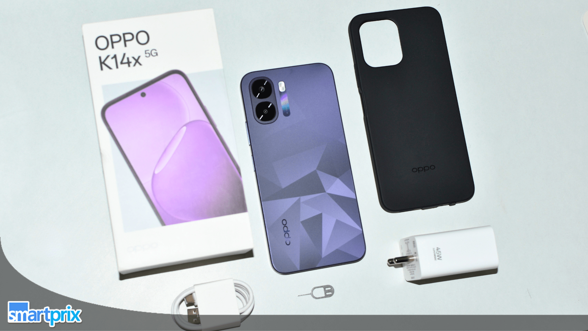 - In the box: 45W charger, USB cable, SIM ejector tool, protective case