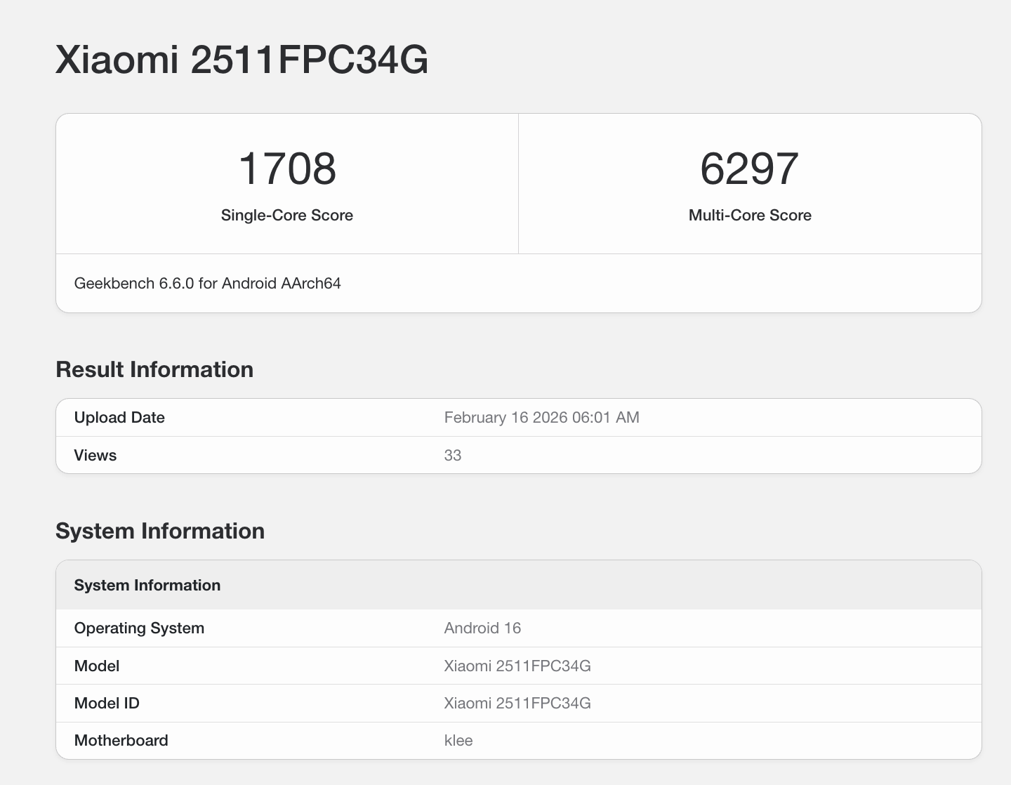 - Benchmark Scores: Geekbench scores of 1,708 (single-core) and 6,297 (multi-core) for the global model (2511FPC34G).