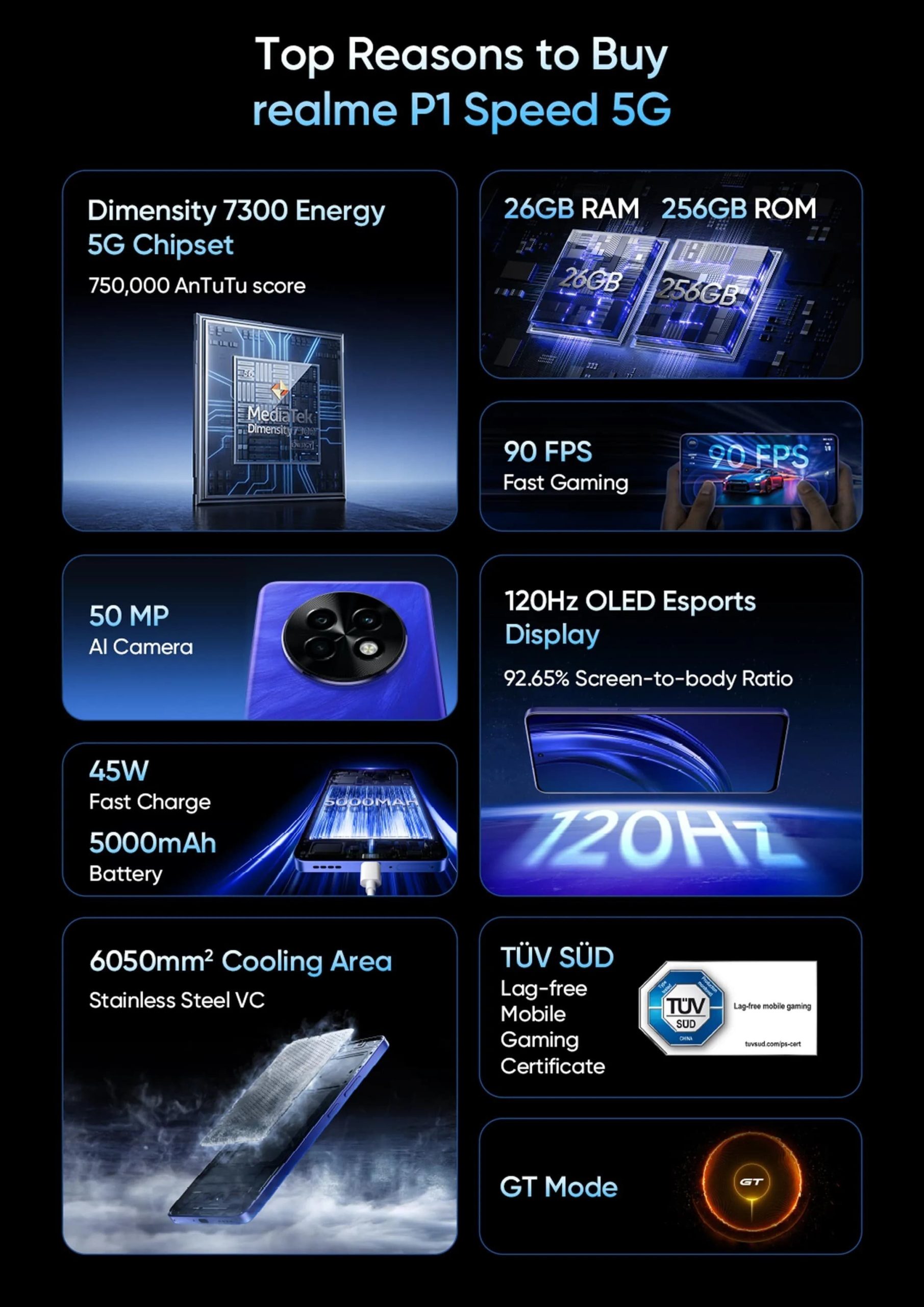 The teaser image shows the device in Blue color with the same circular camera module and a flat-screen. The smartphone will have 26GB RAM and 256GB storage and feature a 120Hz display at the front. There will be a 50MP main camera at the back and under the hood will be a 5000mAh battery with 45W charging. For thermal performance, there will be a 6050mm square cooling system and a GT mode for faster performance. For connectivity, there will be Bluetooth 5.4 and WiFi 6. The smartphone will have a thickness of 7.6mm and an IP65 rating. For audio, it will have dual stereo speakers.
