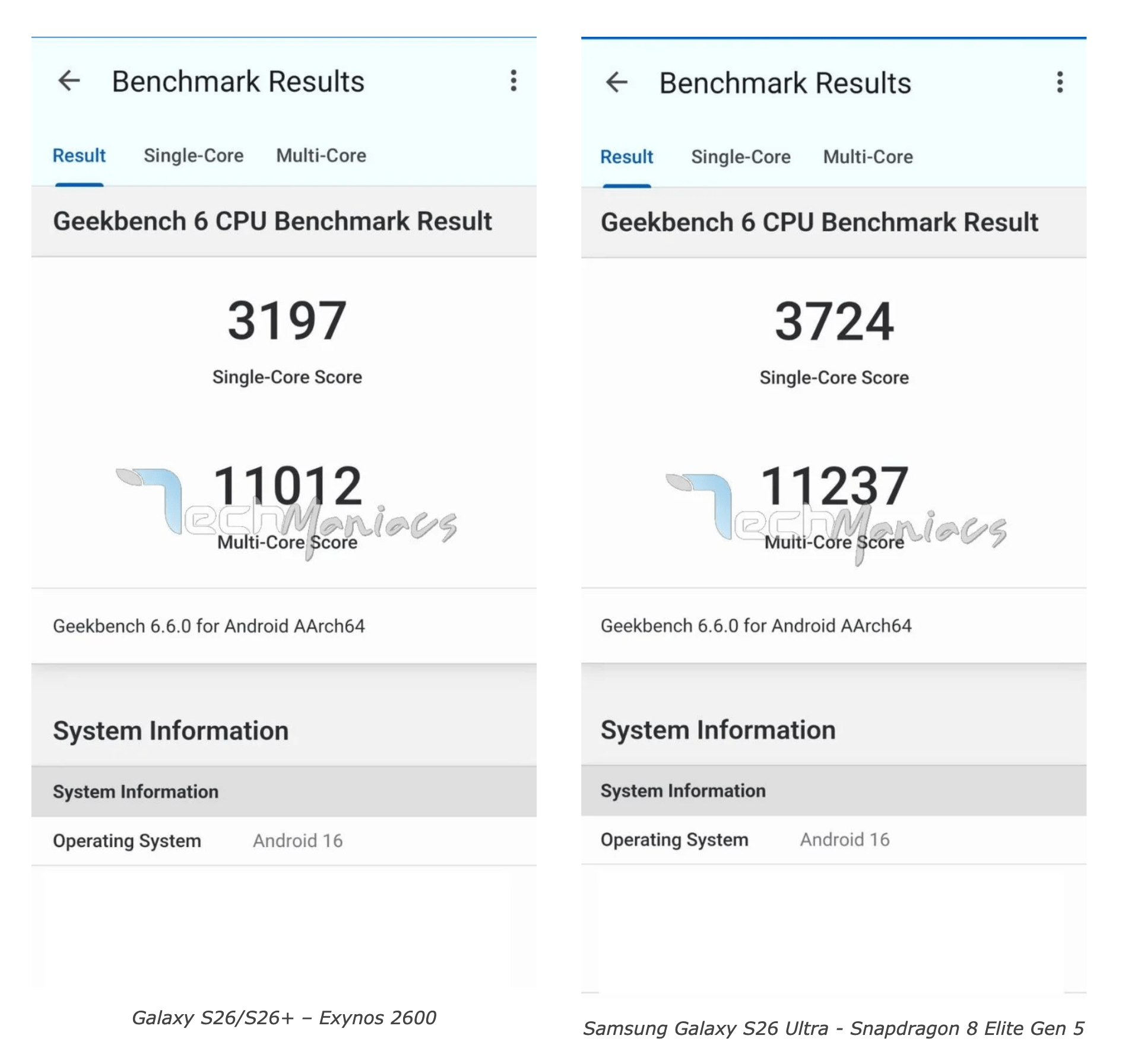 That’s the situation we know of. A new report from the Greek publication Techmaniacs sheds more light on this, highlighting the differences between the Snapdragon 8 Elite Gen 5 for Galaxy and the Exynos 2600. The publication has identified the chipsets in Geekbench’s database, and we’re primarily interested in the performance scores.