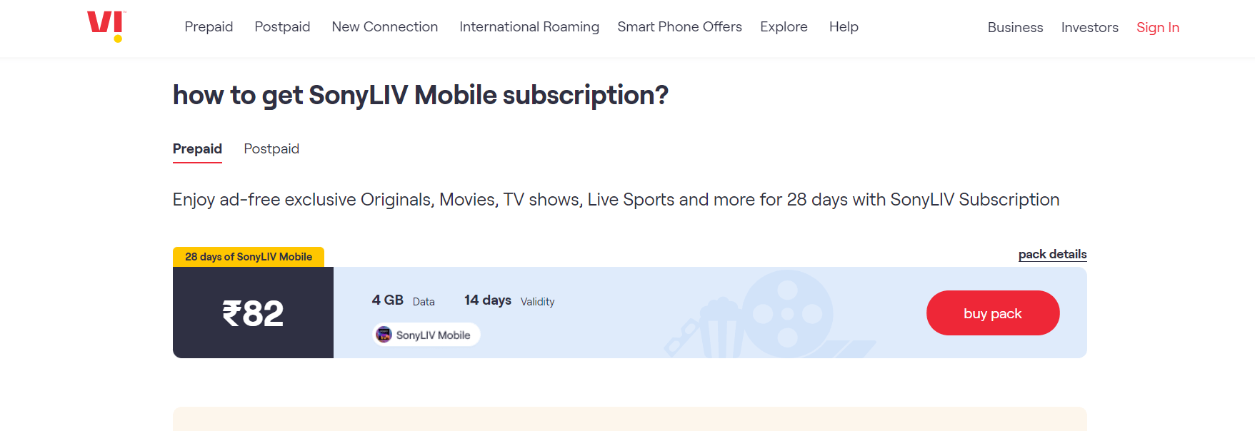Vodafone Idea is offering free access to Sony LIV Premium subscription with its range of postpaid plans. Users can select an add-on pack on their postpaid of Rs. 100 per month to get a Sony LIV Premium subscription for free. There is an Rs. 82 data voucher plan as well which provides free access to Sony LIV Mobile for 28 days.
