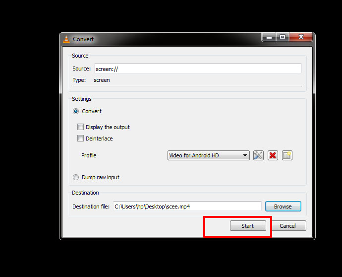 - Next, click on ‘Start’. Now you will see a black screen with number ticking at the bottom. Worry not, your screen recording is now on. Just minimize VLC and proceed with whatever you wish to record.