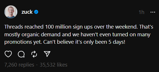 Launched on Wednesday – July 6, the app received massive popularity citing an ongoing feud between Twitter’s Elon Musk and Meta’s Mark Zuckerberg. Threads was a smash hit scoring two millionth marker in the first two hours. It steadily reached various milestones only to reach the 100 millionth mark earlier on Monday as per Zuckerberg.