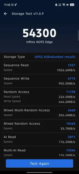 | AnTuTu Storage Score | 71,948 Sequential Read: 1042 MB/s; Sequential Write: 522 MB/s |