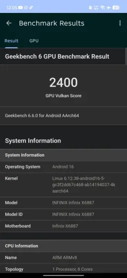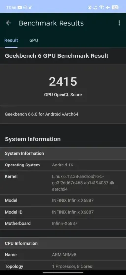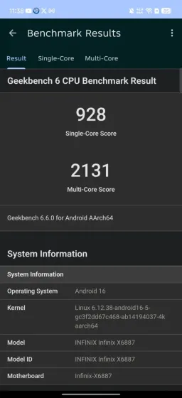 | Geekbench Score | 2,131 (Multi Core) (v6) 928 (Single Core) 2,450 (OpenCL) 2,494 (Vulkan) |