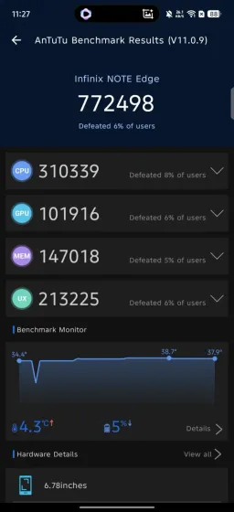 | AnTuTu Score | 772,498 (Total) (v11) 310,339 (CPU) 101,916 (GPU) 147,018 (Memory) 213,225 (UX) |